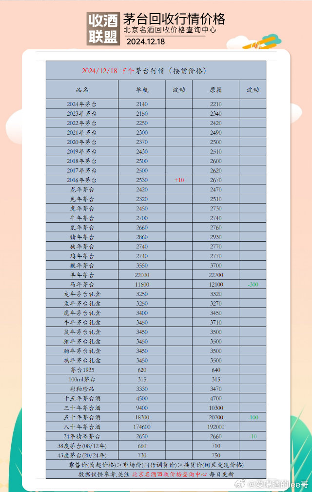 摘要:最新茅臺酒報價成為市場熱議的話題,本文為您探尋市場價格的奧秘。茅臺酒作為中國高端白酒的代表,其價格受到多種因素的影響,包括市場供需、經(jīng)濟形勢、品牌效應等。本文將從多個角度深入分析茅臺酒的市場價格走勢,幫助您了解市場動態(tài),把握投資機會。